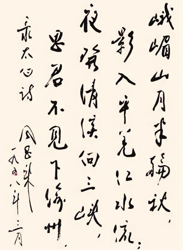 唐诗宋词都是书法家们最为独爱的内容,诸如我们熟悉的李白诗《峨眉山月歌》,也成为书法家们笔下常写的内容之一,“峨眉山月半轮秋,影入平羌江水流。夜发清溪向三峡,思君不见下渝州。”,这首诗歌寄情于山水,在书法家的笔下,也能够表现出这种动态之美,就连周总理对这首诗歌都情有独钟,还书写了书法作品,众所周知,我们见到他的周总理书法,多为一些题字作品,或者是书写交流,而这幅书法作品,是我们第一次见到,与众不同,这首诗歌,其他名家,诸如徐渭、林散之等等也写过,但是却无法比肩,下面就让我们一同来欣赏一番吧。