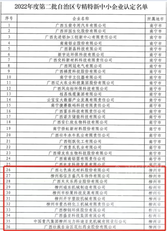经过公示,柳州有18家企业进入2022年广西壮族自治区第二批“专精特新”中小企业认定名单。至此,柳州市已有112家“专精特新”中小企业,在全区中排名第二位。