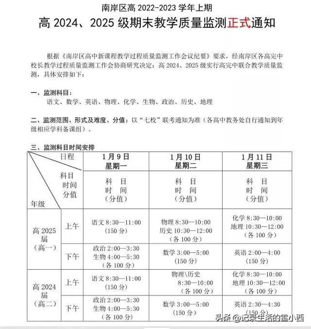 目前,重庆市主城七校,各年级期末考试时间,考试范围已出,一起来看看延期了吗?在南岸区高2022-2023学年上期的2024级、2025级的期末考试通知上看到,监测范围以“七校”联考通知为准!